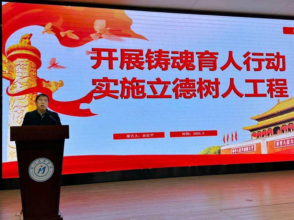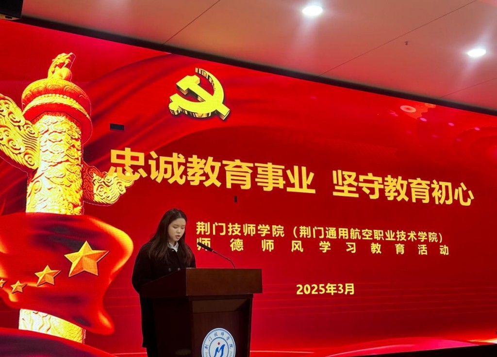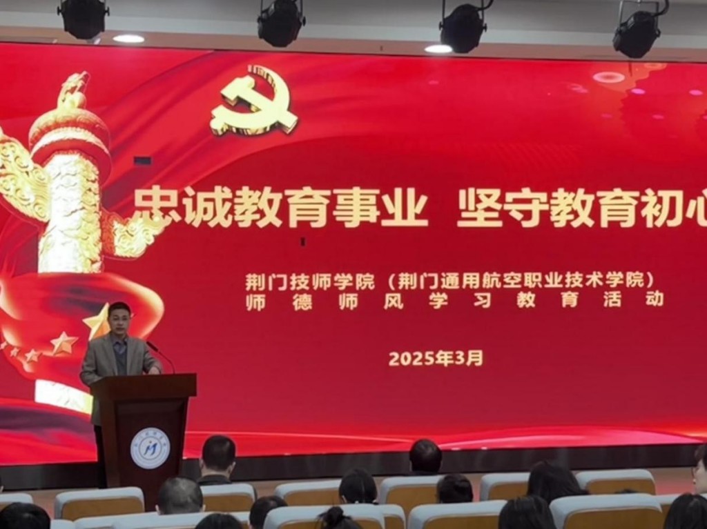 2025年3月21日,荆门技师学院(荆门通用航空职业技术学院)在图书馆学术报告厅召开 “忠诚教育事业,坚守教育初心”师德师风主题教育活动,全面加强党建和思想政治工作,探讨师德师风建设长效机制,努力建设政治素质过硬、业务能力精湛、育人水平高超的高素质教师队伍。学校副校长余忠平同志出席此次活动并作重要讲话,教务处主任端木祥慧主持会议。