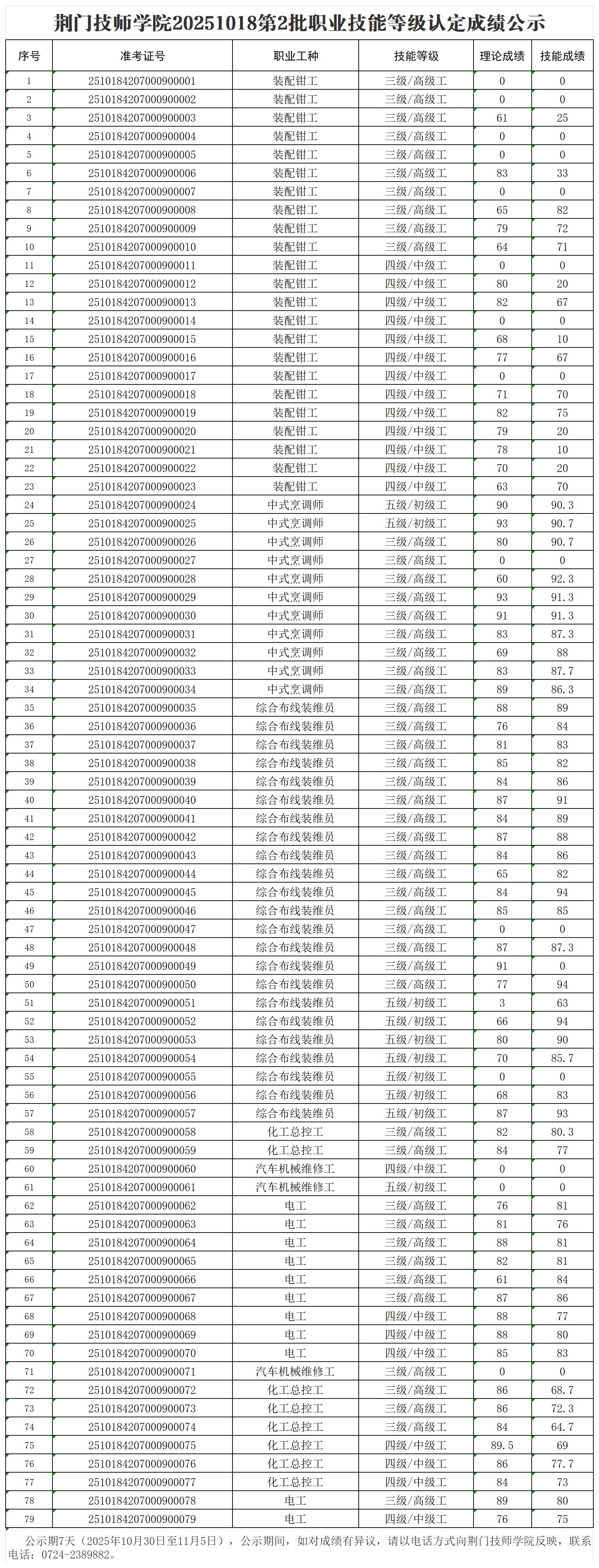 荆门技师学院20251018第2批职业技能等级认定成绩公示