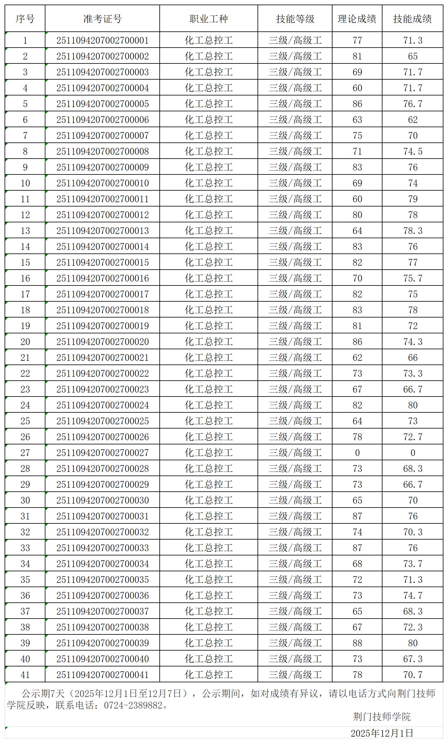 荆门技师学院20251109第5批职业技能等级认定成绩公示