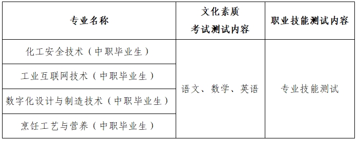 第十四条 此次高职单招招生考试采取“文化素质+职业技能测试”的模式,考试时间为4月6日(其中文化素质测试时间为9:00—11:00,职业技能测试时间为13:30-18:00)。各专业考试方式具体见下表。