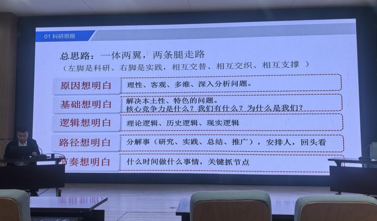 紧接着,科研及质量管理处青年教师李赛松以《科研思路及方向》为主题进行了分享。他延续了此前科研集训的前沿视角,进一步聚焦于科研工作的起点规划。