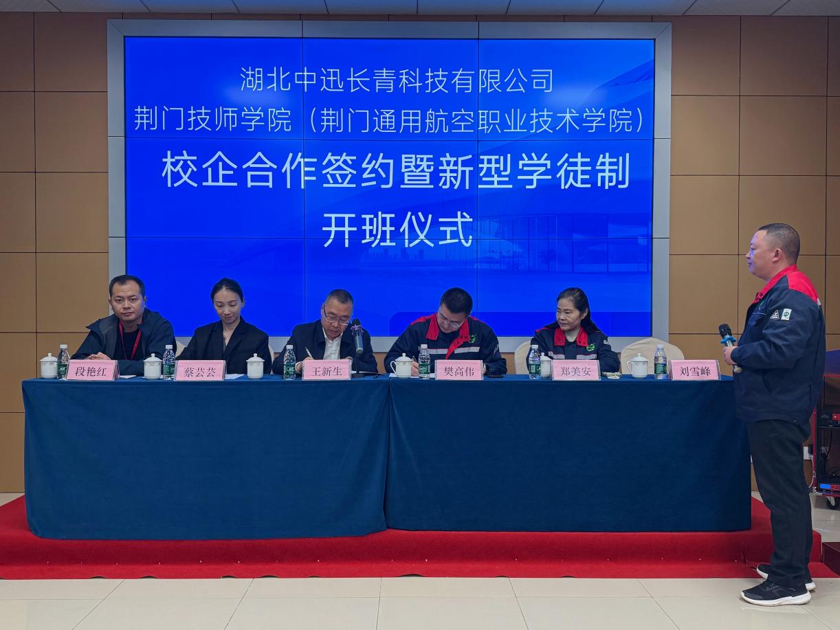 11月1日,荆门技师学院第五期新型学徒制班在湖北中迅长青科技有限公司正式开班。荆门技师学院院长王新生与湖北中迅长青科技有限公司总经理樊高伟共同出席了开班仪式。此次活动还同步启动了2023级新型学徒制班化工总控工中级职业技能等级认定考试,标志着双方在技能人才培养及产教深度融合方面迈出了更加坚实的一步。