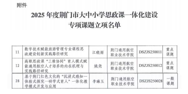 根据荆门市教育局《关于公布2025年度荆门市大中小学思政课一体化建设专项课题立项名单的通知》,我校共有3个项目成功获批立项,其中含重点课题2项、一般课题1项。