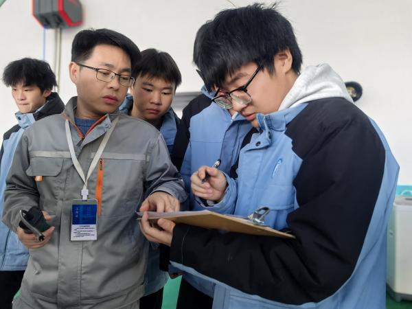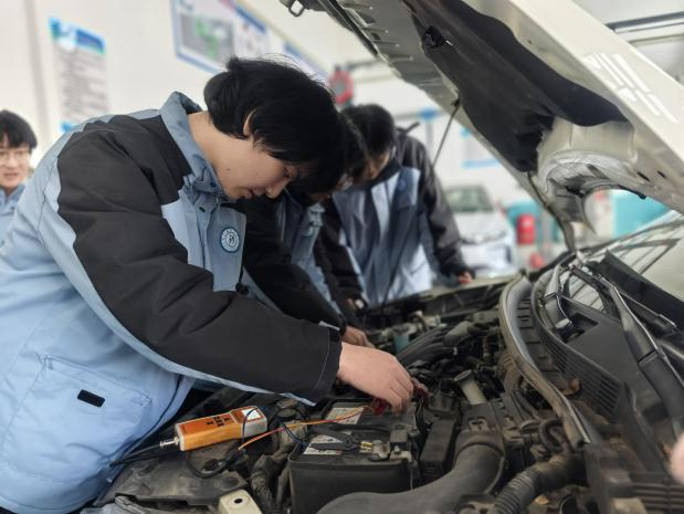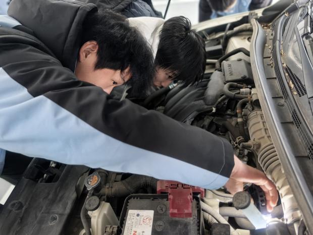 在核心服务区域里,游浩然与刘锐锋搭档细致检查空气滤清器,不遗漏任何可能影响车辆性能的微小细节;左雨权娴熟地为轮胎充气,确保行车安全无虞;陈董鹏全神贯注地检测车辆电池,为冬日用车彻底排除电力隐患;龚新伟则手持工具精心清扫车面,用耐心让每一辆车都焕发光彩。从专业检测到清洁保养,同学们分工明确、配合默契,以实际操作技能生动诠释了“学以致用”的真谛。