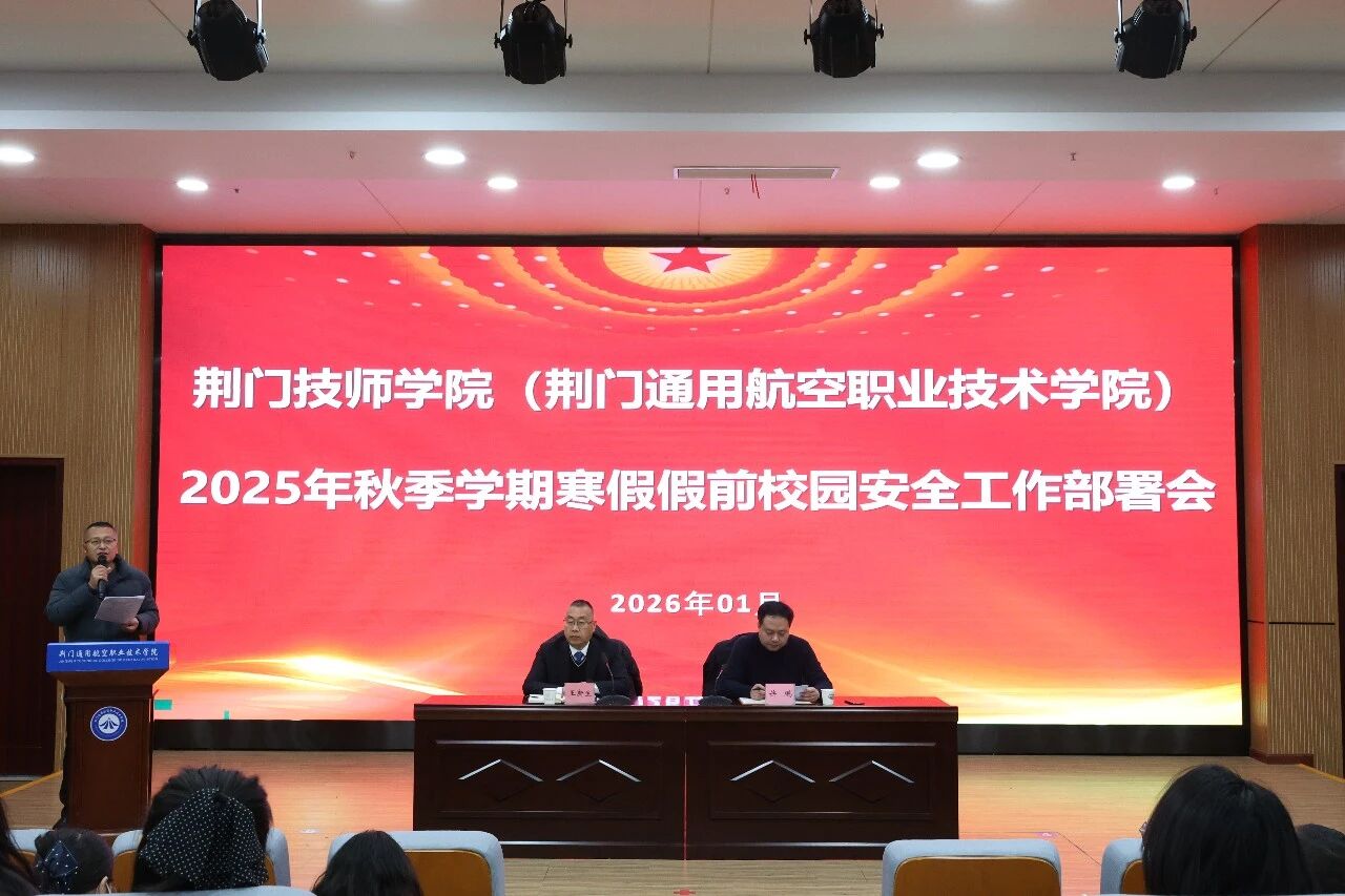 为切实保障寒假期间校园安全稳定,全面部署假期前后安全管理工作,1月25日上午,荆门技师学院(荆门通用航空职业技术学院)在图书馆学术报告厅召开2026年寒假前后安全工作会议。院长王新生、副院长许鹏出席会议,各科室及二级学院负责人、全体中(高)职辅导员与班主任参会,会议由副院长许鹏主持。