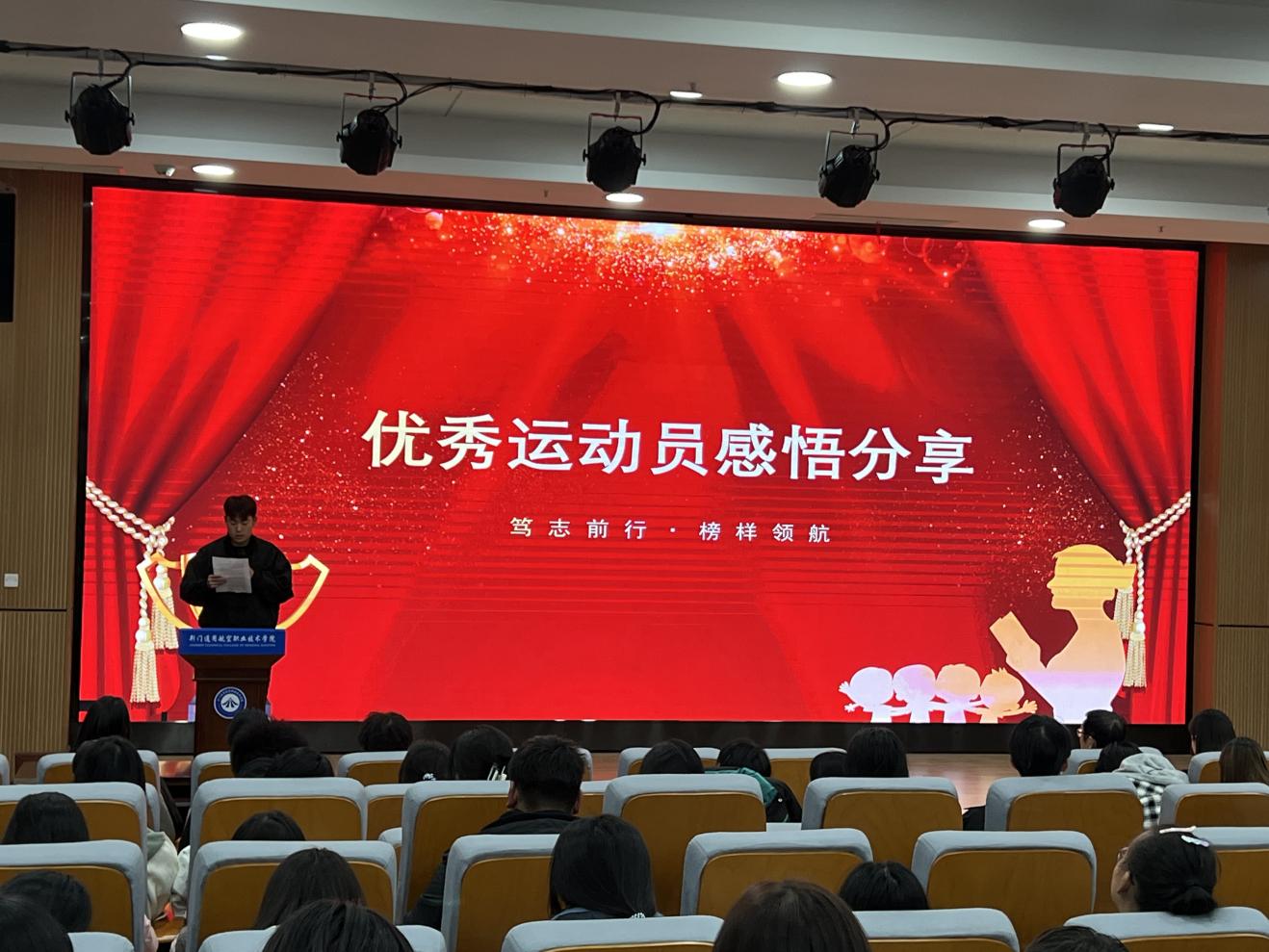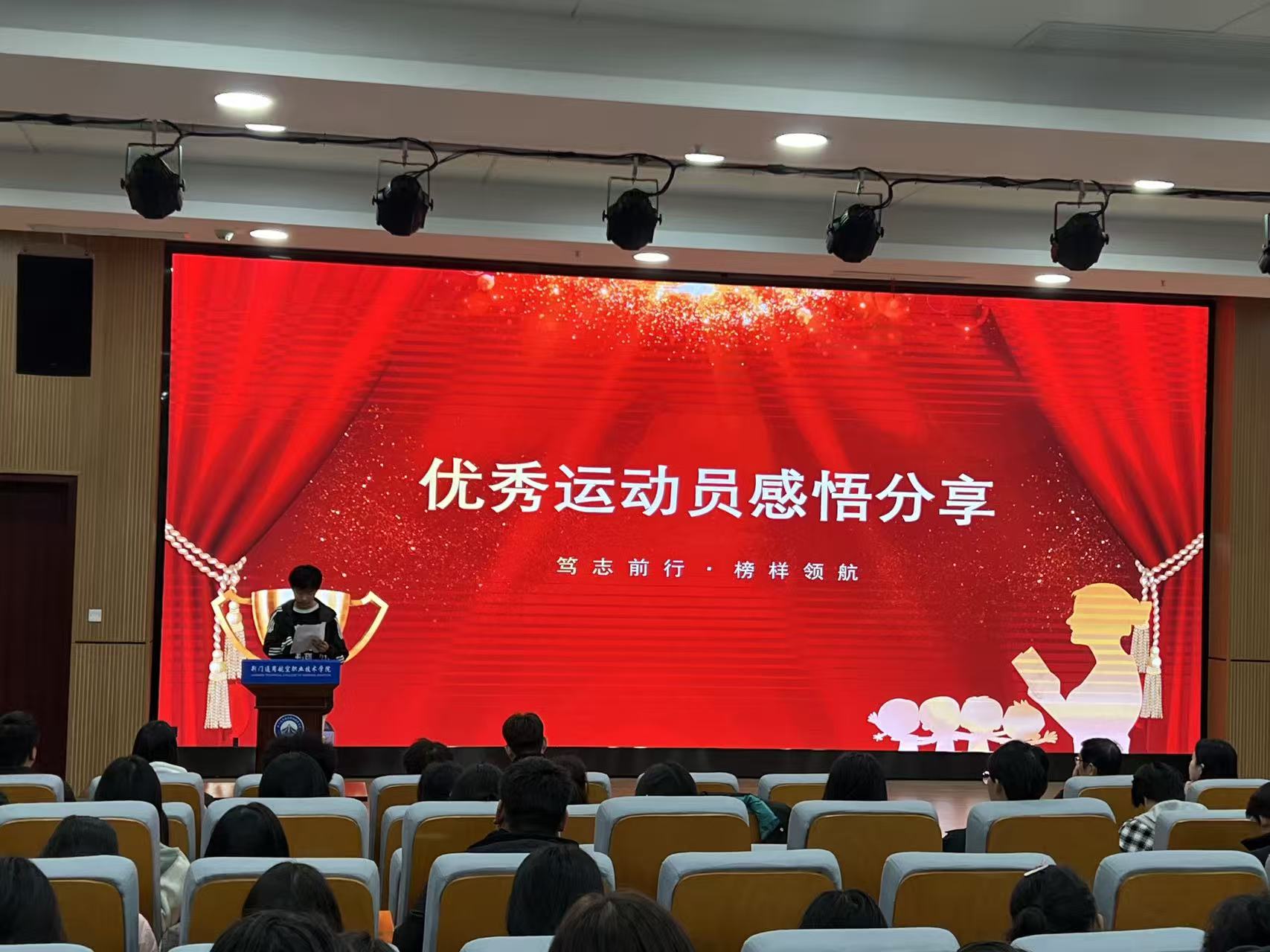 大会现场氛围庄重而热烈,周大勇院长与袁秋芹主任共同为在运动会中表现突出的优秀教师、运动员及先进团体颁发荣誉奖项。掌声与喝彩声此起彼伏,既是对获奖者拼搏精神的高度肯定,更是对全院学子奋勇争先的有力激励。随后,优秀教师代表、获奖运动员代表及学生会文体部部长依次登台发言。他们分享了备赛训练的艰辛历程、赛场角逐的热血感悟与服务保障的责任担当,用真挚的话语传递着对体育精神的深刻理解,对学院发展的满腔热忱,引发全场师生的强烈共鸣。
