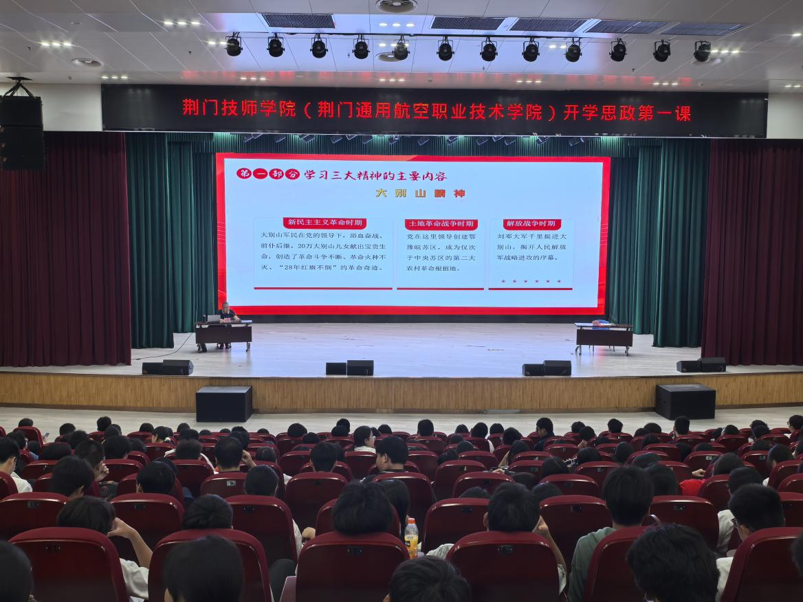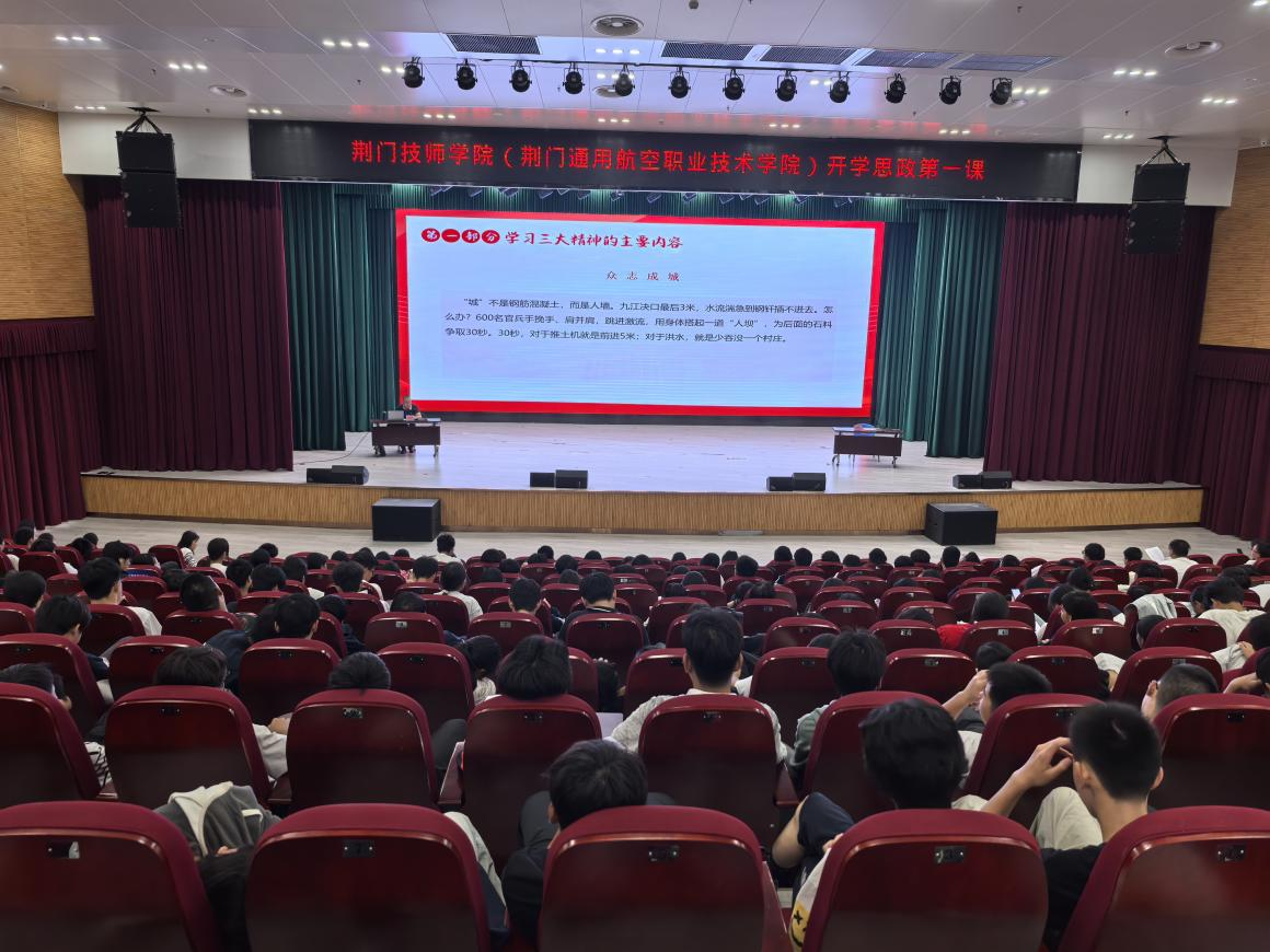 金秋九月,丹桂飘香,9月12日,荆门技师学院(荆门通用航空职业技术学院)2025 年开学思政第一课如期而至。本次课程以“弘扬三大精神,汇聚奋进力量”为主题,由校长王新生主讲,带领我校学子重温红色记忆,感悟时代精神,为新学期注入强劲的精神动力。700余名学生现场聆听讲课。