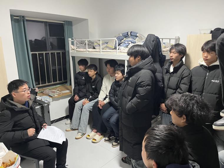 宣讲结束后,小组成员深入学生宿舍开展全面安全巡察,逐一排查住宿环境中的安全隐患。期间,范老师发现陈宇泽同学的床铺护板存在松动问题,当即动手进行加固处理,用贴心举动为学生撑起“安全保护伞”,让实习学生在校外感受到学院的关怀与温暖,进一步筑牢了校外实习安全防线。