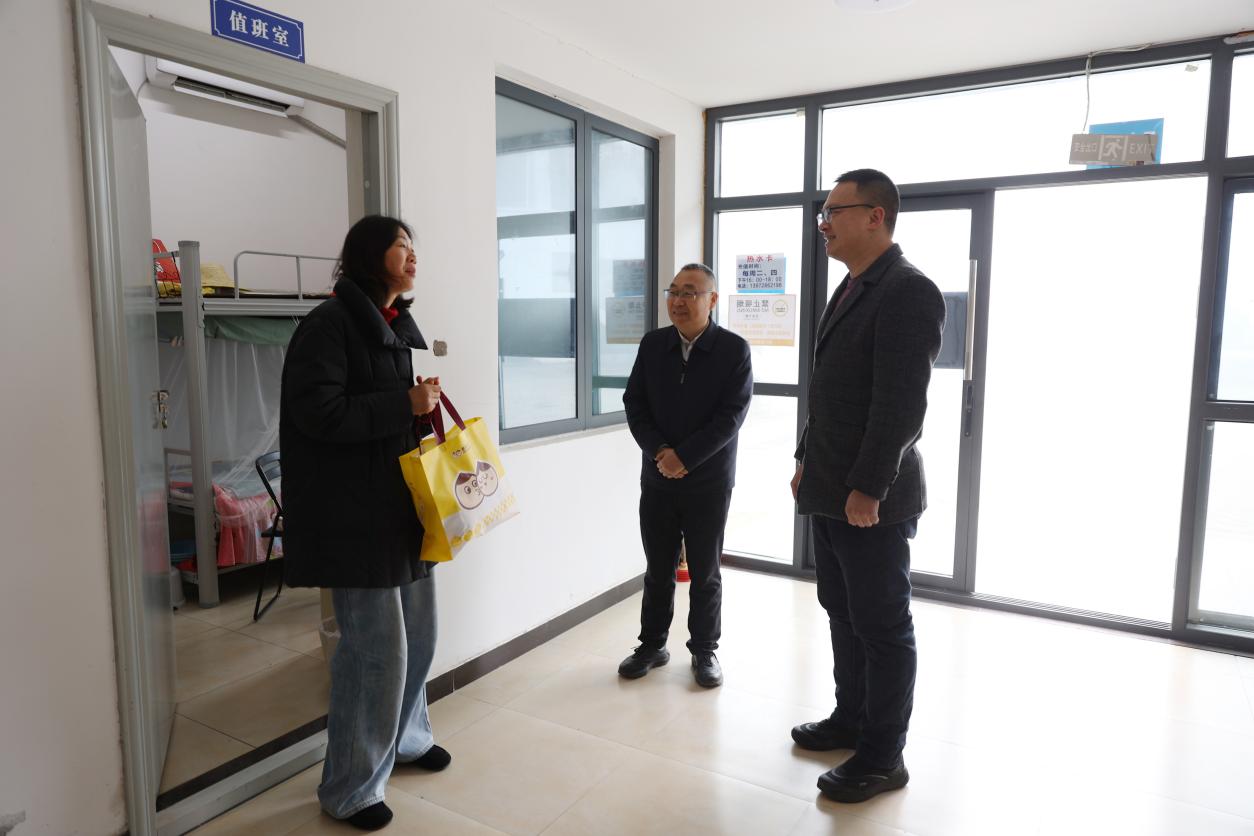 走访结束后,姚尧、王新生一行来到校园值班岗位、安保值班室、学生公寓等一线场所,看望慰问坚守岗位的值班老师、安保人员与宿管人员。校领导与大家亲切交流,详细了解假期值班安排、校园值守、后勤保障等工作情况,对大家放弃节日休息、坚守岗位、履职尽责的奉献精神给予高度肯定,叮嘱大家做好自身防护、注意劳逸结合,切实履行好岗位职责,用心守护校园平安与师生安宁,并向坚守一线的教职工及家人致以新春问候和美好祝愿。