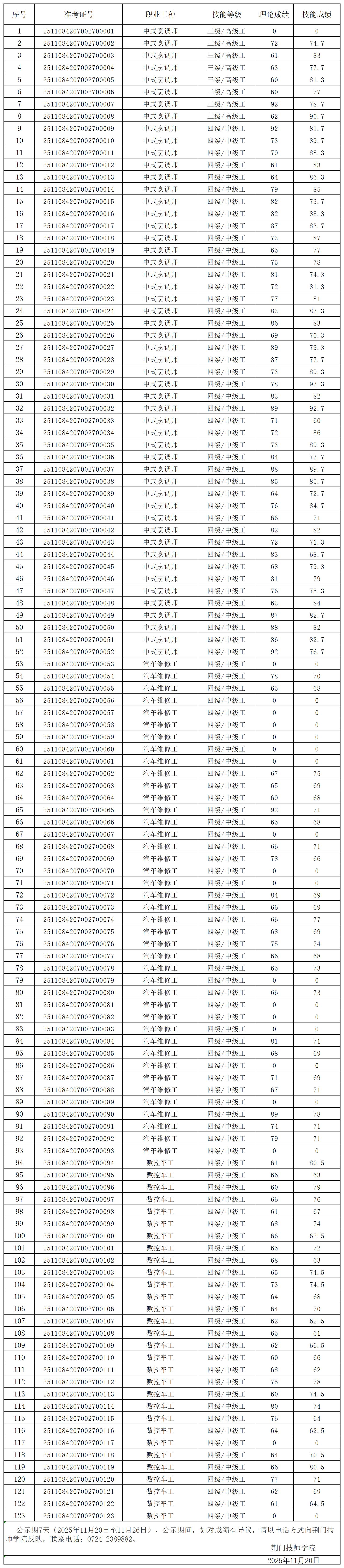 荆门技师学院20251108第4批职业技能等级认定成绩公示