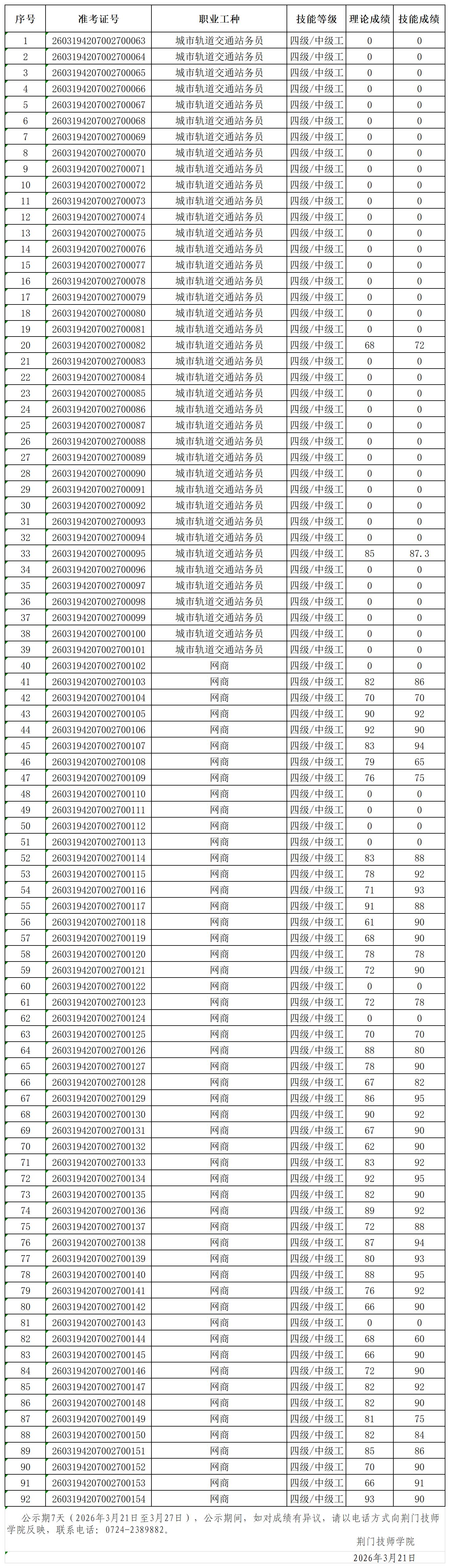 荆门技师学院20260320第8批职业技能等级认定成绩公示