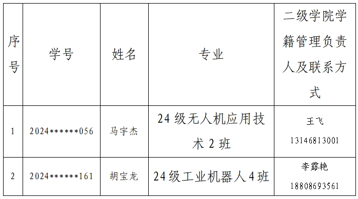 根据教育部《普通高等学校学生管理规定》(教育部令第41号)和《荆门通用航空职业技术学院学生学籍管理办法》要求,为确保学校教育教学工作的正常进行和学生管理的规范性,现将我校2025至2026学年度第二学期,开学后逾期未报到学生的退学处理情况公示如下: