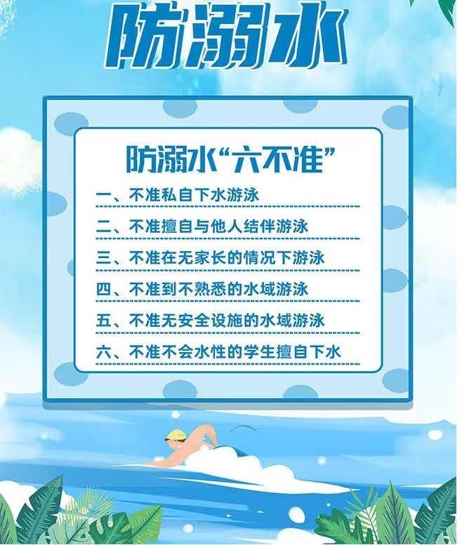 1.严格遵守“六不”:不私自游泳、不擅自结伴、不在无监护下游泳、不到无安全设施水域、不到不熟悉水域、不盲目下水施救。