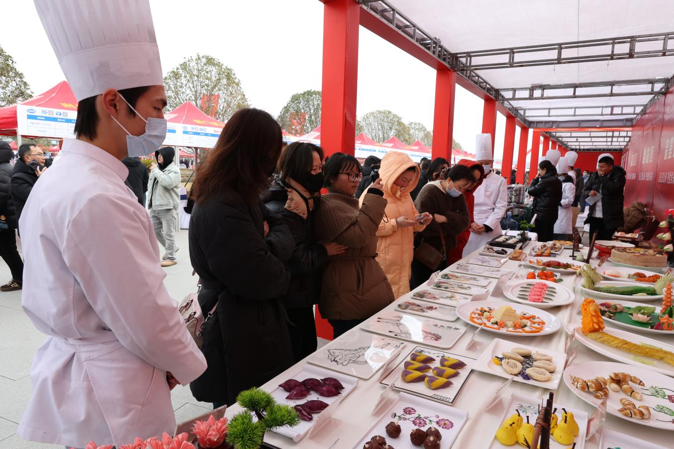 学院烹饪专业的师生还紧扣荆楚饮食文化内核,以“劳动光荣,技能宝贵”为创作灵感打造精美食品雕刻,同时烹制出长寿蟠龙卷、长湖鱼糕等荆门特色菜肴,搭配太师饼、桃花酥等传统点心。鲜香兼具、颜值俱佳的家乡美食,吸引了大批返乡人员驻足观赏、拍照打卡,大家在品鉴熟悉风味的同时,更感受到了扑面而来的浓浓乡情与暖心关怀。 不少返乡人员纷纷表示,这样的技能展示既贴近生活又独具特色,让他们对学习实用技能、扎根家乡实现就业创业充满了信心。